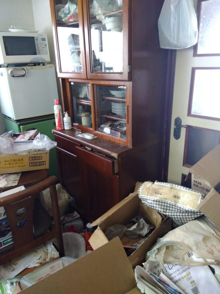 大量の家具・衣類・紙類が散乱していた和室は、