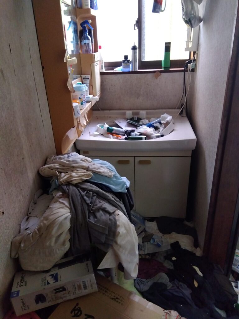 浴室にも衣類や洗面容器が持ち込まれ、浴槽内にも残置物がそのまま放置されていました。