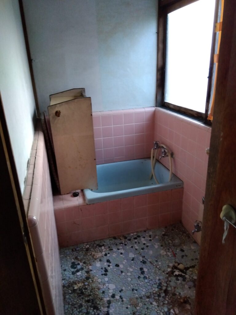 床タイルには汚れとカビが広がっており、通常の入浴利用は不可能な状態