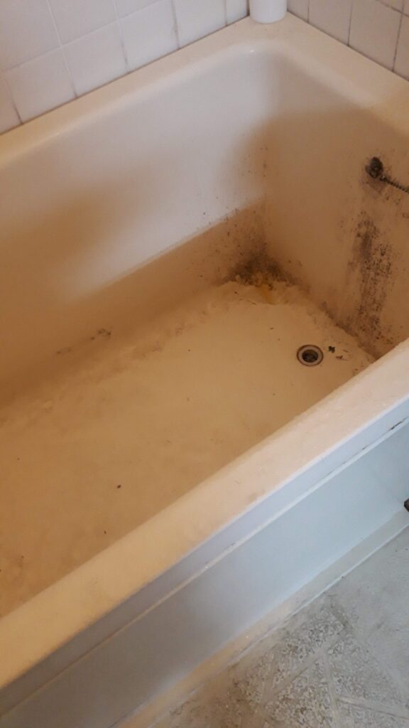 浴槽・床・壁面に強い汚れが広がり、
