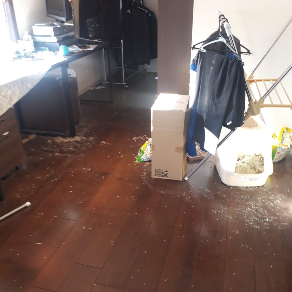 ケージ周りの汚れや床への付着物、生活用品や衣類・書類などが混在し、